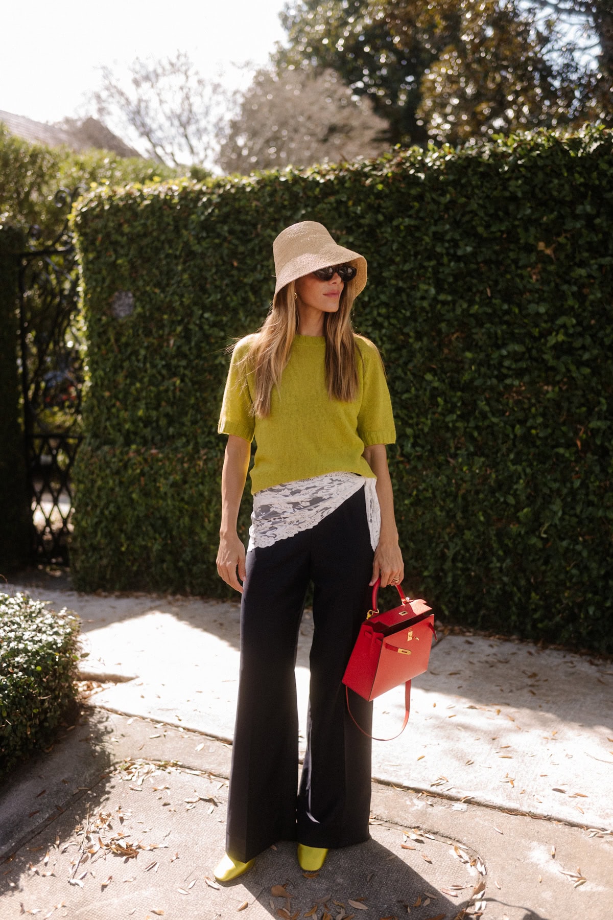 chartreuse short sleeved sweater raffia bucket hat lace and silk pants red handbag chartreuse heels